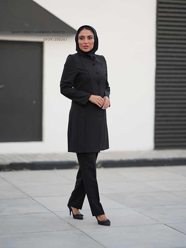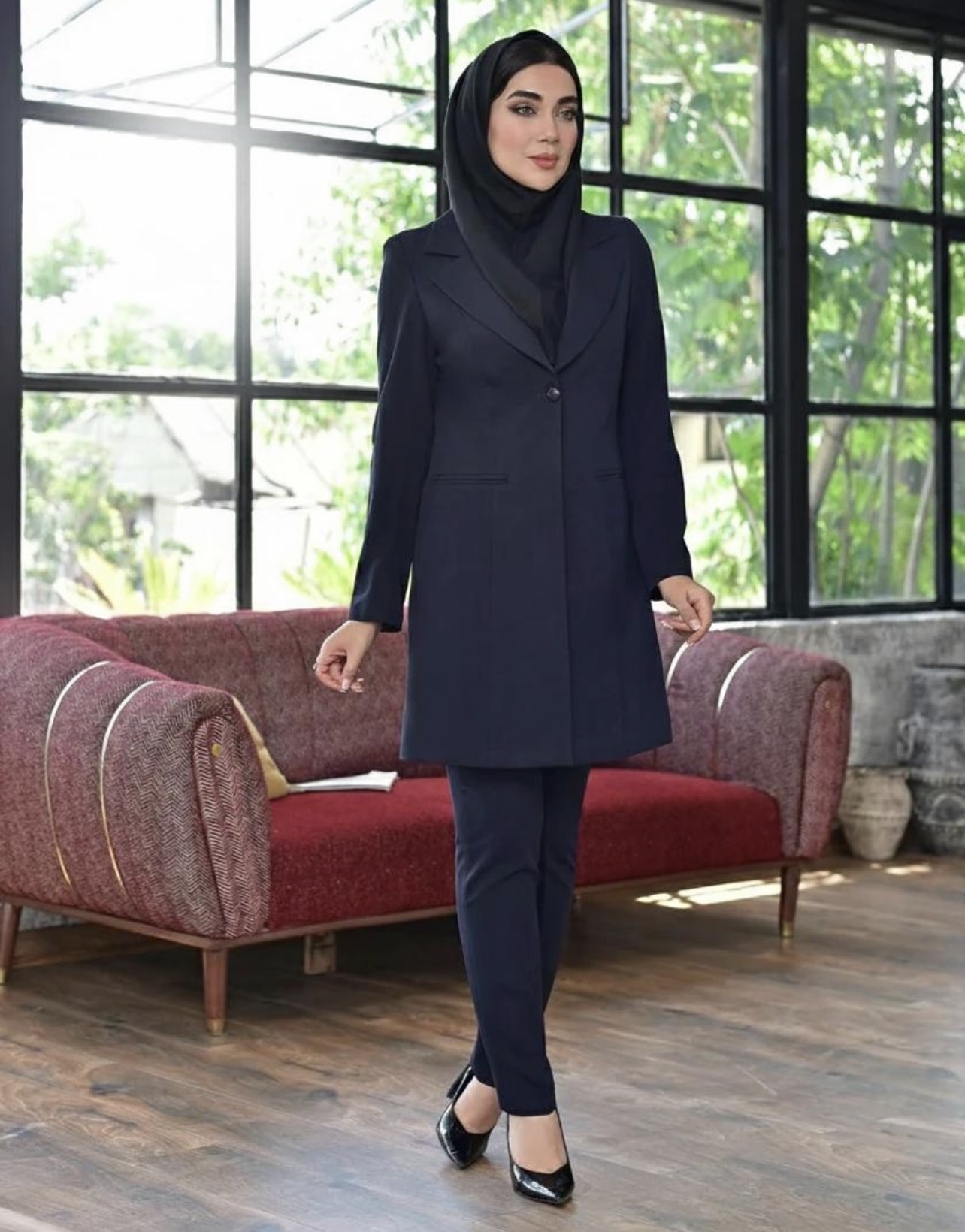 مانتو شلوار اداری یقه انگلیسی تک دکمه بلند فیونا کد 680